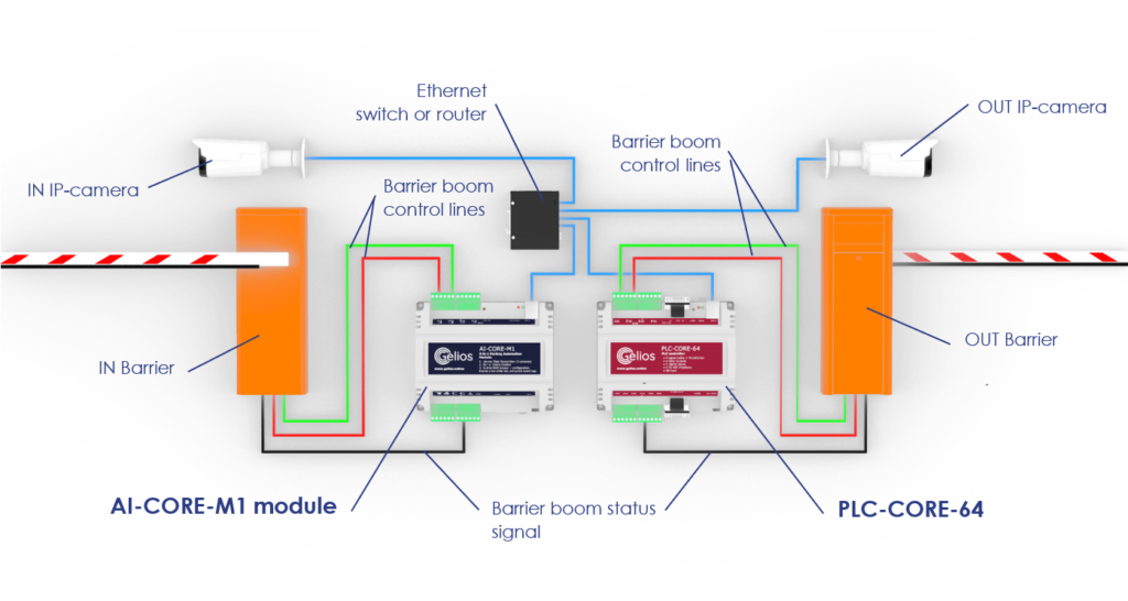 • La electrónica de GELIOS AI-CORE-M1 está diseñada específicamente para esta aplicación: una PCB de grado industrial con una CPU basada en Linux que ejecuta el software de reconocimiento, además de un controlador dedicado para el control de barreras o portones. Todas las entradas y salidas cuentan con aislamiento galvánico, con una línea de alimentación independiente para contactos secos y relés.